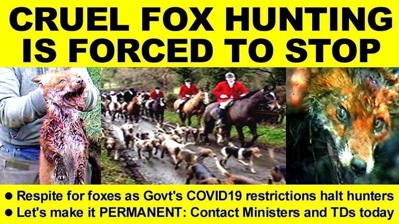 A notice posted on the Countryside Alliance Ireland website outlines that “in line with Irish Masters of Foxhunting Association advise [sic], hunting and all fun rides are suspended.” The stoppage of hunting is not actually as a result of “advice” from the IMFHA but as a result of the government’s COVID19 nationwide restrictions which clearly state: “no organised outdoor gatherings should take place". They also limit domestic travel to 5km from home, meaning that hunters would not be able to come together from far and wide to indulge in their barbarity.