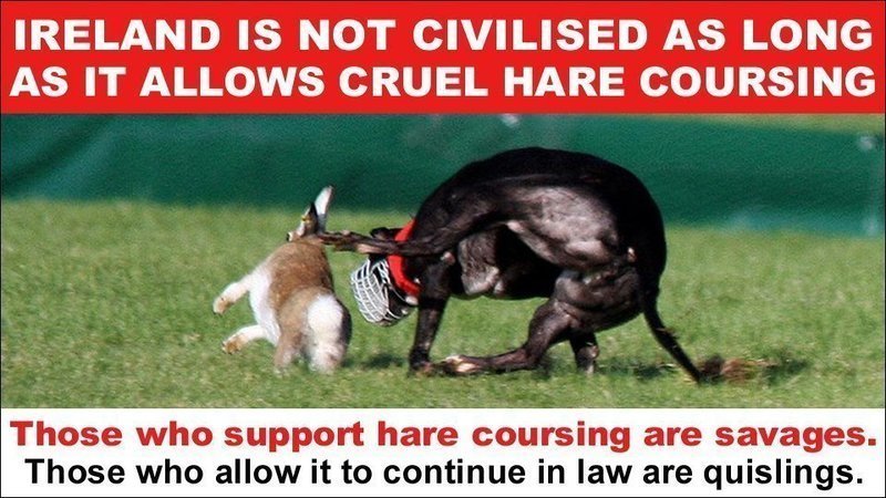 Yet, while England, Scotland, Wales, and Northern Ireland prohibit coursing, we, in 21st century Ireland, allow it. What a sorry indictment of our claim to be civilised people at the cutting edge of Europe. Those who support coursing are savages. Those who allow it to continue in law are quislings. They should try being hunted down by Rottweilers — but given a so-called escape route at the end of the course, of course.