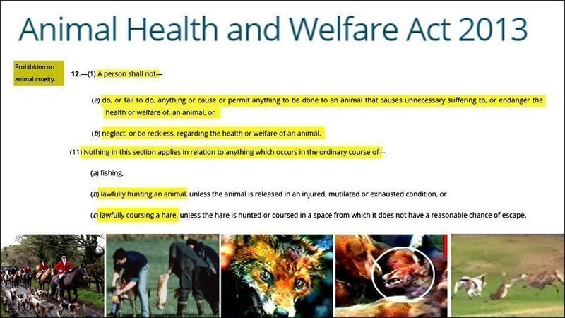 The shameful exemptions in the Animal Health & Welfare Act which allow cruel coursers to terrorise hares with greyhounds and allow hunters to release packs of hounds to chase foxes http://www.irishstatutebook.ie/eli/2013/act/15/enacted/en/print#sec12
