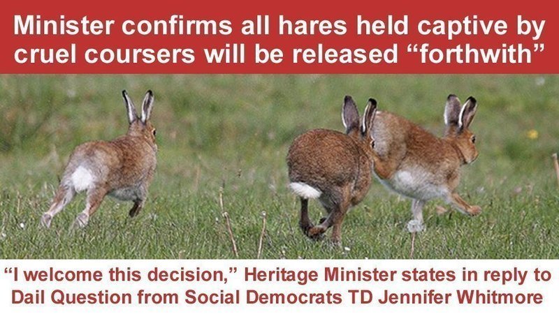 Minister O’Brien told Deputy Whitmore that “the Irish Coursing Club has informed my Department that all hares currently held in captivity by coursing clubs will be released forthwith.”