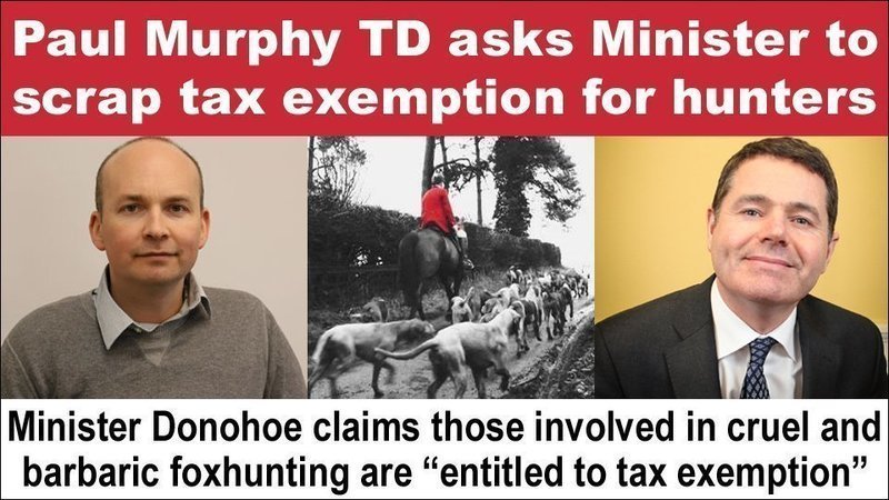 Thanks to Paul Murphy TD for asking the Minister for Finance "if he will remove fox hunts and an animal shooting organisation from the Revenue Commissioner's list of 'sports' bodies that have been granted tax exemption".