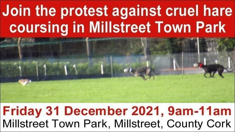Please support the protest against cruel hare coursing in Millstreet Town Park - tomorrow, Friday 31 December 2021, 9am to 11am at Millstreet Town Park, Millstreet, County Cork.