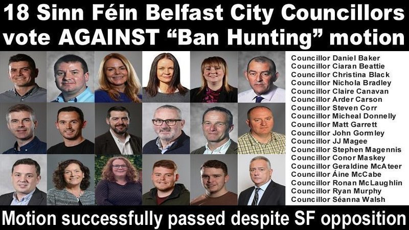 18 Sinn Fein Councillors voted against a “Ban Hunting” motion at a meeting of Belfast City Council on Monday (10 Jan 2022). Sinn Fein was the only party to oppose the motion which called for a ban on hunting animals with dogs, including cruel fox hunting, deer hunting and hare hunting.