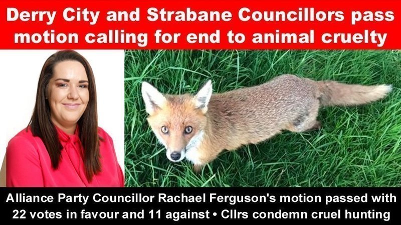 Introducing the motion at the 24 February 2022 meeting of Derry City and Strabane District Council, Cllr Rachael Ferguson (Alliance Party) stated: “A ban on hunting with dogs in Northern Ireland is long overdue. I strongly believe that animals being ripped to shreds by a pack of dogs for human enjoyment cannot be considered a sport.”