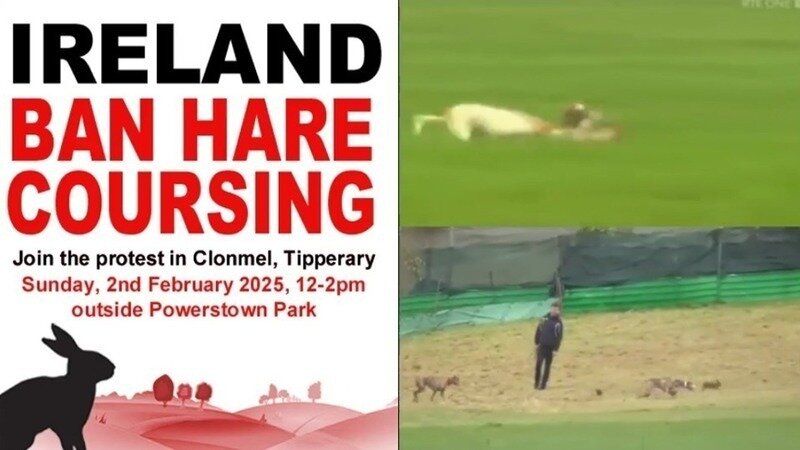 Please join the peaceful protest against cruel hare coursing outside Powerstown Park, Clonmel, Co. Tipperary this Sunday, 2 February 2025, from 12 midday to 2pm
