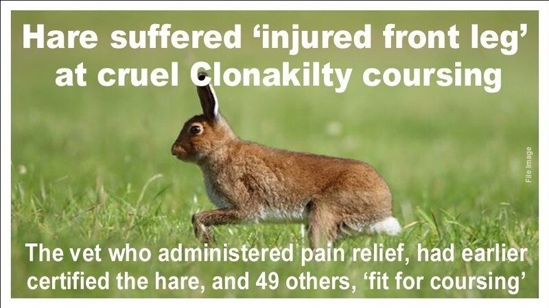 A hare who was hit by a greyhound at a shameful coursing event in Clonakilty in January suffered an injured leg, recently released documents reveal.