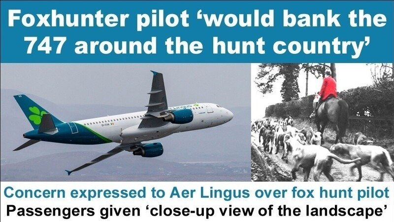 Concern has been expressed to Aer Lingus over a troubling hunt report which stated that a foxhunter pilot “would bank the Jumbo Boeing 747 around the hunt country before landing” to observe activities on farmland (to help the hunt in the planning of hunt routes).