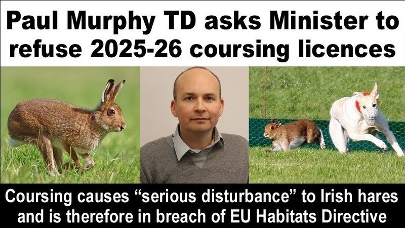 Paul Murphy TD has asked the Minister for Heritage to refuse 2025-26 licences for hare coursing due to the fact that the cruel activity breaches the EU Habitats Directive.