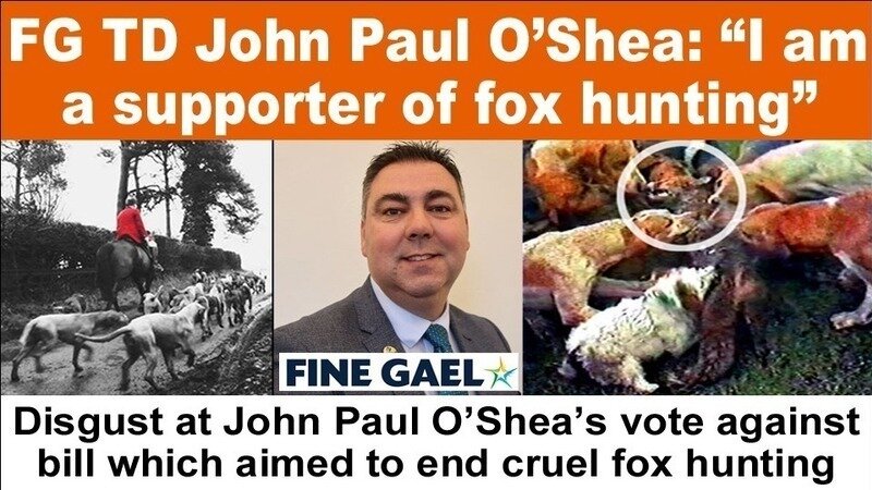"I am a supporter of fox-hunting" - John Paul O’Shea TD (Fine Gael, Cork North West) shamefully expressing support for a bloodsport which involves abhorrent animal cruelty. Foxes are chased by packs of hounds and when caught, they are knocked to the ground, bitten, disembowelled and pulled apart.