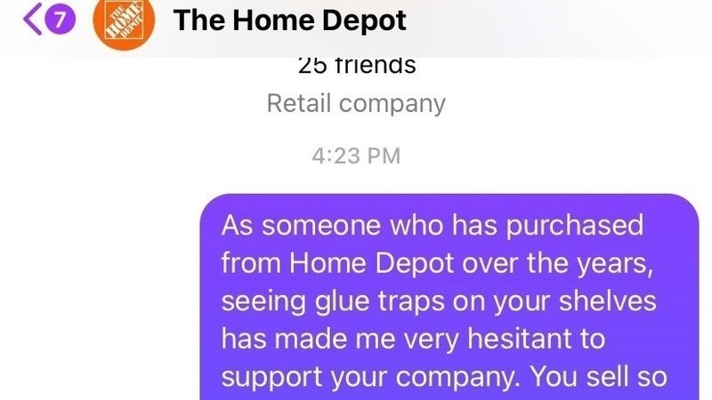 We are aiming to get dozens and dozens of people to message Home Depot on Facebook calling on them to stop selling glue traps in the next 24 hours.