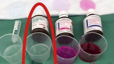 Indistinct chlorhexidine (circled) is easily mistaken for other colourless solutions leading to the suffering of many patients. It's been injected into patients spines causing paralysis, legs leading to amputation, and arteries supplying the brain causing agonising death.