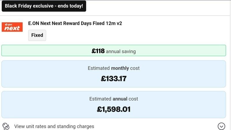 Just a final remind that the E.ON Next Reward Days Fixed 12m v2 tariff ends today as it was a Black Friday deal. This tariff comes with 3 days free electricity on 24, 25 and 26 December, as well as being £118 cheaper than the price cap currently is. With the cap going up in January and predicted to rise in April as well, it's an excellent idea to switch to a fixed rate tariff now.