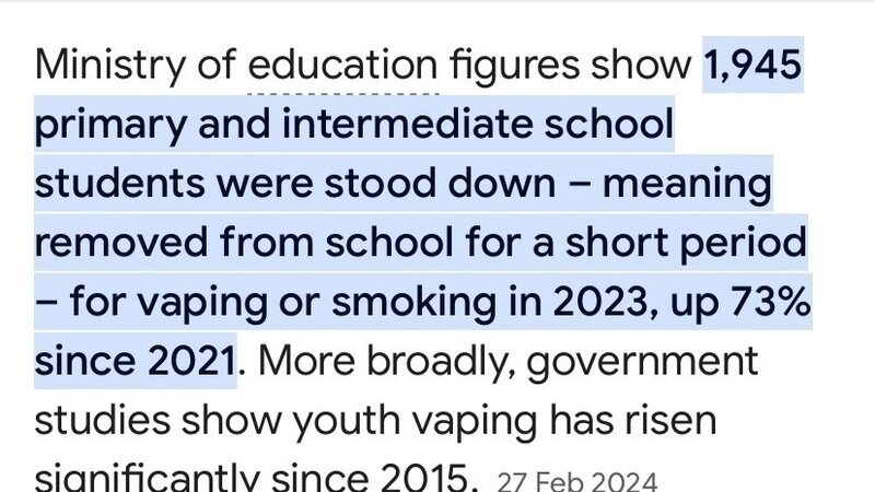 (You have seen this statistic. It demonstrates the nature of the problem, when primary and intermediate children, i.e. the very young, cannot remain at school due to their vaping. This update is a bit of a 'What now..')