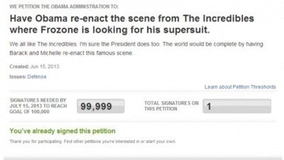 We all like The Incredibles and I'm sure the president does too. The world would be complete by having Barack and Michelle re-enact this famous scene.