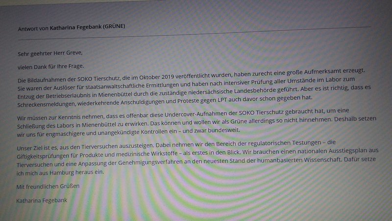 Immerhin hat Frau Fegebank gestern auf meine Anfrage über abgeordnetenwatch.de vom 05.02.2020 reagiert wie folgt:
