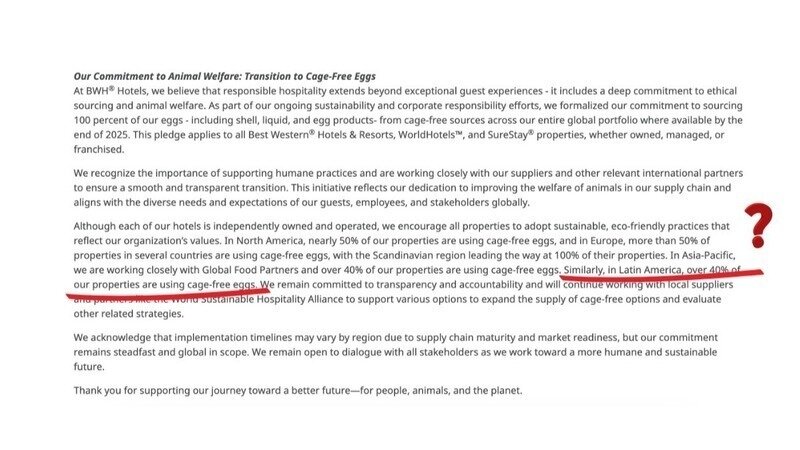 Hace unos días, y gracias a tu movilización en esta campaña, Best Western actualizó su progreso afirmando que más del 40% de sus hoteles en Latinoamérica utilizan huevos de gallinas libres de jaula (lee el fragmento traducido aquí). ¡Éste es un gran avance! Pero no es suficiente, pues no especificaron si esos hoteles usan exclusivamente huevos libres de jaula, o si también siguen usando huevos de gallinas enjauladas. Además, ¿qué pasa con África? La empresa no ha compartido ninguna información sobre esa región. ¡Sigamos exigiendo un plan claro para cumplir su promesa al 100% en los próximos cinco meses!