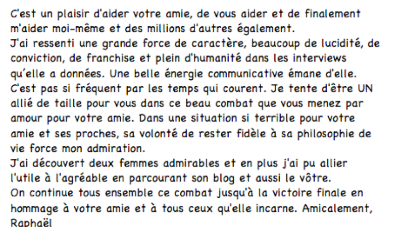J'ai reçu un mail de Raphaël qui m'a beaucoup encouragée (ci-haut). N'hésitez pas, vous non plus, à m'écrire pour me faire part de vos expériences personnelles, de vos souhaits et de vos craintes aussi. Tout cela me servira de munitions, étant entendu que je ne divulguerai rien qui permette de vous identifier.