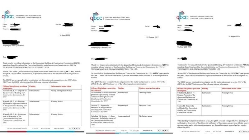 Tilson & Sons Director & QBCC Licenced builder, Declan Tilson has not provided homeowners evidence of verbal statements made, provided evidence to support written communication & complied with QCAT Directions. All the while TILSON uses the FAILINGS OF THE REGULATOR & delays in the judicial system to sell their assets, business/family premises, move locations & leave homeowner's with financial, mental & emotional trauma and stress.