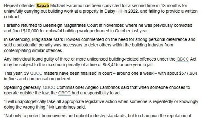 Magistrate Mark Howden made a substantial penalty as a clear message to rogue builder who continues to breach industry legislation & building standards. It is unfortunate that homeowners become the collateral damage under the extreme stress & trauma imposed on a broken & failed system.
