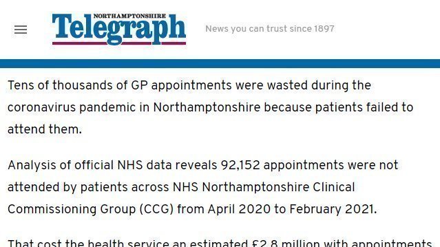 Today's headline in our local newspaper sums up why this petition is needed. I cannot believe how much people take our health services for granted - and during a global pandemic, when health services are already stretched and NHS staff are putting themselves at risk to care for us. This is outrageous. Less GPs, less funding, more patient demand, more wasted appointments, a global pandemic...ENOUGH IS ENOUGH, surely!