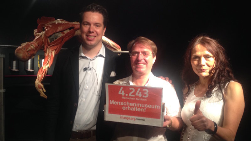 Auf der heutigen Pressekonferenz wurden die Änderungen vorgestellt, welche die weiteren Betrieb des MeMu trotz einstweiliger Schließungsverfügung zum 29.08.16 ermöglichen. Gemäß den Vorgaben des Urteils des OVG wurden alle Plastinate, bei denen eine Zuordnung zum Spender nicht mehr nachvollziehbar war, gegen neue ausgetauscht, bei denen das nun mittels einer unauffälligen Nummer den Behörden auf Verlangen ermöglicht werden kann. Des Weiteren, wird das MeMu nun direkt durch das Institut für Plastination e. K. (Dr. Angelina Whalley) betrieben und nicht mehr von einer GmbH. Dadurch entfällt nach Aussage von Rurik von Hagens die Genehmigungspflicht durch den Bezirk Mitte. Wenn wir die 5000 Unterschriften erreicht haben, wollen wir diese Petition Herrn Hanke übergeben. Damit ist dann wohl hoffentlich das Schließungsthema vom Tisch! Wir drücken weiter die Daumen! Dr. Angelina Whalley und Rurik von Hagens sind jedenfalls begeistert von der Petitions-Resonanz und optimistisch. Danke nochmals an alle Unterzeichner!