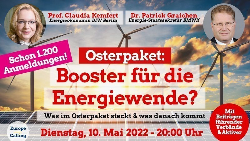 Um die schlimmsten Folgen der Klimakrise für Natur & Menschen noch abzuwenden, braucht die Energiewende einen Booster. Dazu hat die Bundesregierung das “Osterpaket” gestrickt. Was steckt drin? Das diskutiert Europe Calling e.V. mit Staatssekretär Patrick Graichen & Top-Energieökonomin Claudia Kemfert. Mit dabei: Verbände mit ihrer Kritik. Gleich anmelden: https://t1p.de/7mph6