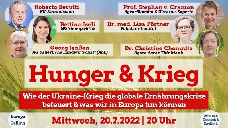 Wie ist die Situation in der Ukraine und in Russland? Wie in den von ausbleibenden Exporten und hohen Preisen betroffenen Ländern? Was können wir in Europa und darüber hinaus tun, um eine Verschärfung der globalen Hungerkrise zu stoppen und endlich nachhaltig den Hunger zu bekämpfen - ohne gleichzeitig die Klima- und Artenkrise anzuheizen?