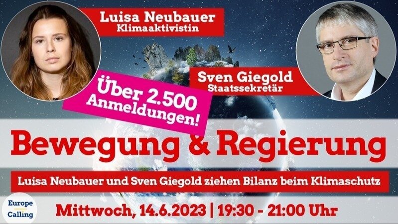 Dazu freue ich mich sehr, dass mit Luisa Neubauer eines der bekanntesten Gesichter der Klimabewegung ins Webinar kommt. Wir wollen darüber sprechen, was Regierung und Bewegung jeweils erreicht haben. Wo wir stehen und wo wir uns gegenseitig sehen. Ein Gespräch über Rollen, Herausforderungen und die Suche nach gesellschaftlichen Mehrheiten und Allianzen.
