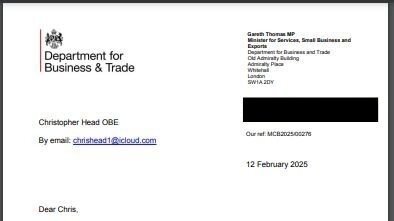 As promised I am publishing the response from the government the Department for Business and Trade and the Minister Gareth Thomas. You can read and share my tweet that includes pictures of the letter in full here :-