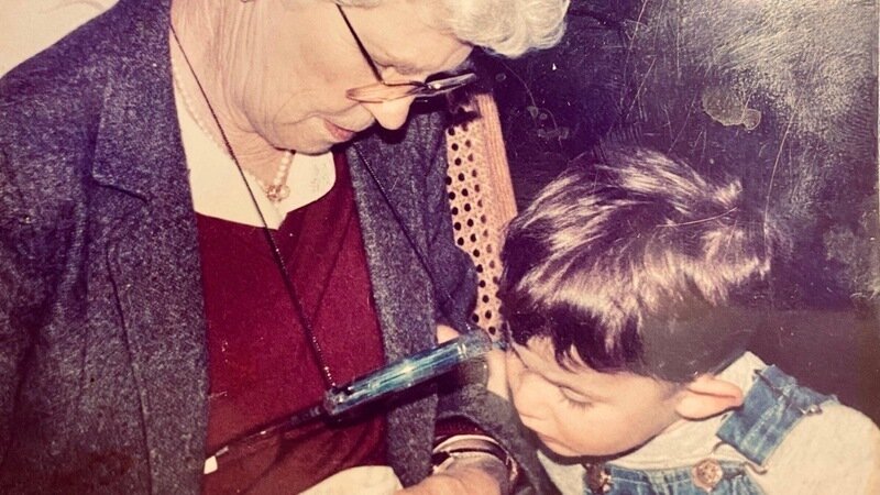 This is my late grandmother teaching me how to needle point when I was “little Andrew”; just a few years old lol.