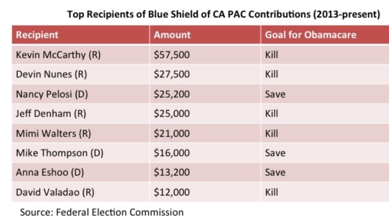Blue Shield, despite claiming to strongly support Obamacare, showers campaign contributions onto Kevin McCarthy, Devin Nunes and others who are trying to kill it.