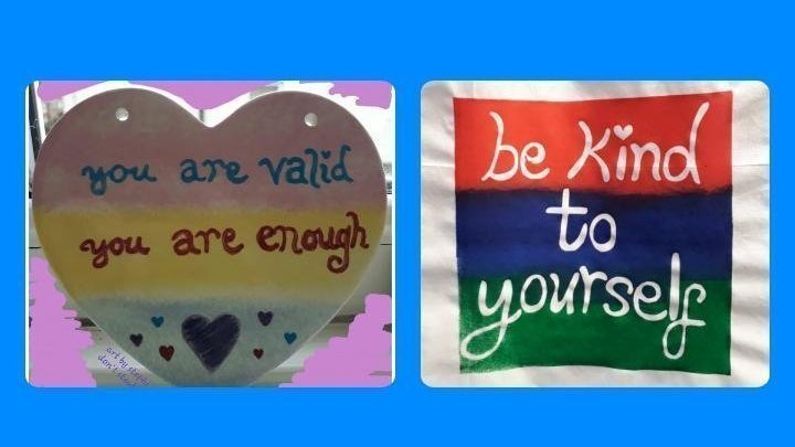 (photo credit- my photos/artwork) [image description- photo collage of two images side by side; the one on the left is a heart with pastel colour stripes- pink, yellow and blue, and text that reads "you are valid, you are enough" with small hearts underneath; the one on the right is a square with bolder colours, screen printed onto a tote bag- red, blue and green stripes in the background and text in cream colour that reads "be kind to yourself"; the main background is sky blue colour]