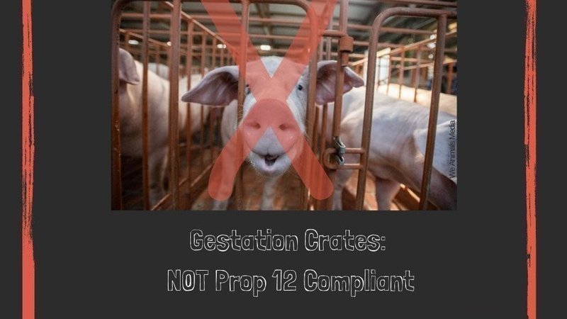In November 2018 a resounding majority of Californians passed "The Prevention of Cruelty to Farm Animals Act", also known as Prop. 12. This law represents the strongest farm animal protection law in the world, and requires that eggs, veal, and pork produced or sold in California are from facilities that do not use extreme confinement methods. This includes meat and eggs produced in other states. The most game-changing element of Prop. 12 is around the use of gestation crates. Starting January 1, 2022, compliance with Prop. 12 means that mother pigs cannot be confined in gestation crates for any part of their pregnancy cycle -- including the first six weeks. Gestation crates are so small that the pig cannot even stretch her legs or turn around!