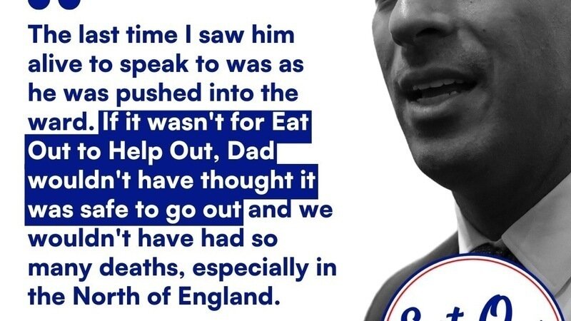 Meanwhile in Blackburn, our member Christina Cramsie has a similarly awful story. She remembers that if it wasn’t for Eat Out to Help, her dad wouldn’t have thought it was safe to go out. Kirsty Sumner remembers that when her dad was in hospital, fighting for his life, the whole system was unable to cope because of the vast number of admissions following the Eat Out to Help Out scheme. Naomi Fulop remembers that when her mother died at the height of the second wave, 1,000 people were dying every day, because Eat Out to Help Out had increased infection rates and communicated to the public that it was okay to let down our guard against the virus. And not a single person in the country doesn’t remember being plunged into a stricter, longer second lockdown than we would have needed had the government taken decisive and consistent action to stop the spread of Covid.
