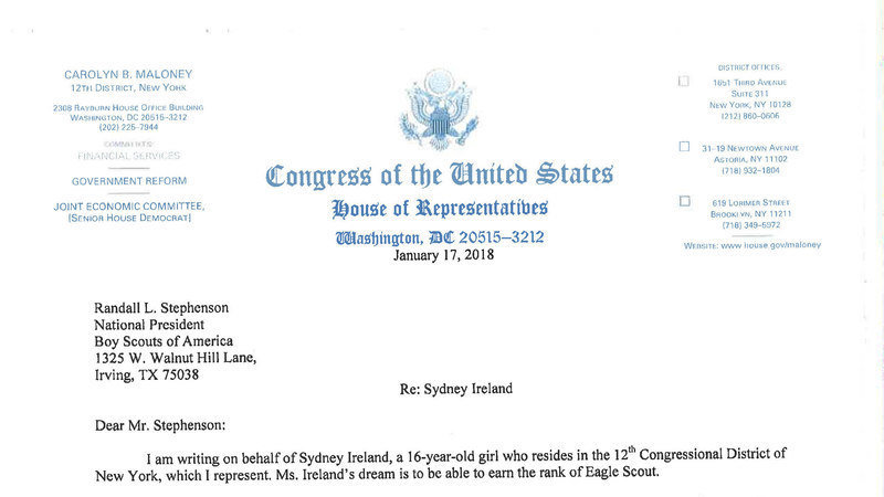 Congresswoman Carolyn Maloney supports Sydney Ireland and other young women in joining the Boy Scouts -- Now. In her letter to AT&T CEO and Boy Scout President Randall Stephenson, Congresswoman Maloney inquires, "I hope that the Boy Scouts will not keep the girls who successfully led the fight for the rule change from benefitting from the change they have achieved..." Congresswoman Maloney adds "I am writing to ask that you consider allowing Sydney Ireland to join the Scouts now..."