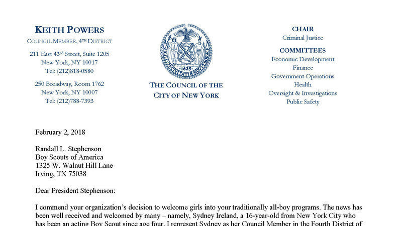 New York City Council Member Keith Powers writes AT&T CEO-BSA President Randall Stephenson, urging the Boy Scout President to "admit Sydney to the Boy Scouts of America," stating that "Sydney started this movement. She serves as a leading voice in this national conversation, publishing an op-ed in 'The Washington Post' calling for girls to be admitted to the program. Because of Sydney, young girls across our nation can choose to be a part of this leading organization."