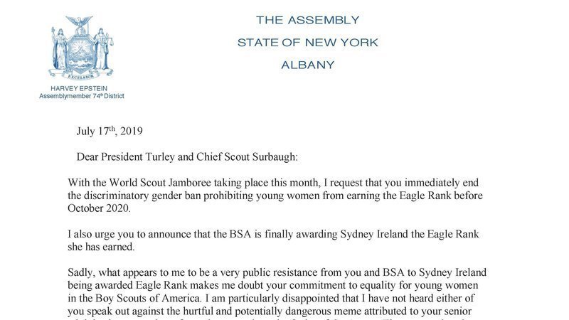 Thank you Assemblymember Epstein for stating, "With the World Scout Jamboree taking place this month, I request that you immediately end the discriminatory gender ban prohibiting young women from earning the Eagle Rank before October 2020... I am particularly disappointed that I have not heard either of you speak out against the hurtful and potentially dangerous meme attributed to your senior adult leader, a member of your honor society, the Order of the Arrow." Please email Boy Scouts President Jim Turley and Chief Scout Michael Surbaugh and ask them to speak out against gender harassment and discrimination in the Boy Scouts. These leaders can be reached at turleyjs@gmail.com; michael.surbaugh@scouting.org; myscouting@scouting.org; effie.delimarkos@scouting.org