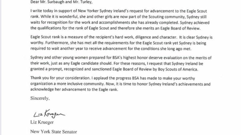 Senator Liz Krueger calls on Boy Scout President, former Ernst & Young CEO Jim Turley, to recognize Sydney’s work and award her the Eagle Rank. Senator Krueger says about Sydney, “(S)he has met all the requirements for the Eagle Scout rank yet Sydney is being required to wait another year to receive advancement for conditions she long ago met...Sydney and other young women prepared for BSA’s highest honor and deserve evaluation on the merits their work, just as any Eagle candidate should.” It was President Turley who personally told Sydney about the discriminatory Boy Scout policy: that for no reason other than she is a girl, Sydney and other young women will have to wait another year to earn the highest award in Scouting, the Eagle Rank.