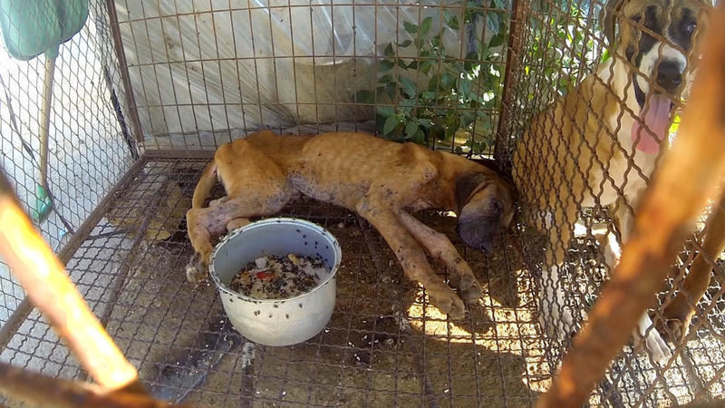The footage contains pictures of seven or eight large Dosa dogs in a tiny and rusty metal cage with no space in which to move.