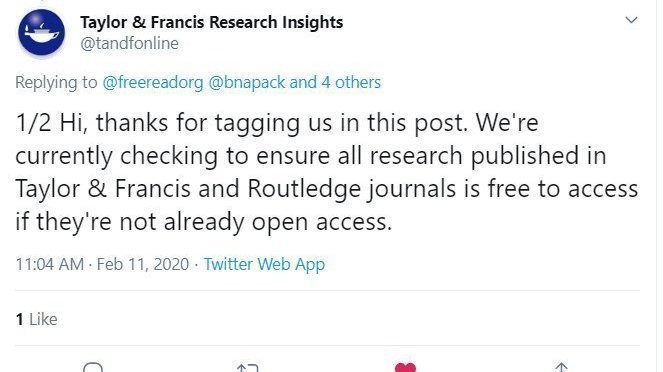 From @tandfonline: Hi, thanks for tagging us in this post. We're currently checking to ensure all research published in Taylor & Francis and Routledge journals is free to access if they're not already open access. 2/2 In addition to this, we’ve also created a reading list for recently published research which we are updating regularly. (go heart their tweet!)