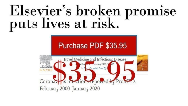 Elsevier may have lied to us. Elsevier claimed to unlock 2,502 articles, but we found that many of these articles were still behind paywall when we checked, including cutting-edge studies like "Coronavirus infections reported by ProMED, February 2000–January 2020." Elsevier has not responded to us, but you can ask CEO Kumsal Bayazit yourself @ElsevierConnect.