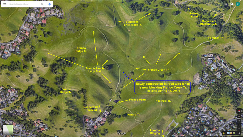 Petition updateReopen Franco Creek Trail (Shell Ridge & Diablo Regional Park, Benham Ct. Trailhead, WC)!Trail is blocked at the dotted blue lines by EBRPD's barbed wire cattle fence