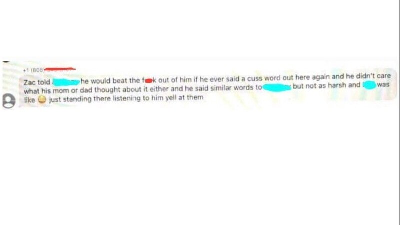 Kylie states in a text message: Zac told “” he would beat the f*** out of him if he ever said a cuss word out here again and he didn't care what his mom or dad thought about it either and he said similar words to “” but not as harsh and “” was like just standing there listening to him yell at them