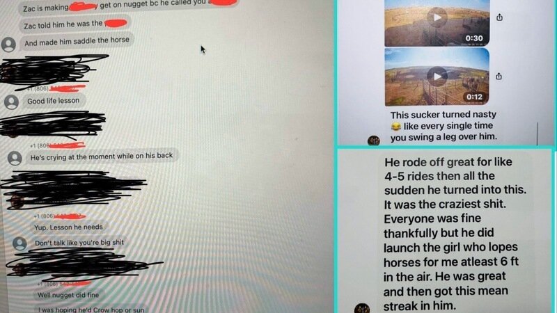 This screenshot shows Kylie bragging about how she and Zac forced a child to saddle and ride a dangerous horse as a way to teach him a lesson for allegedly using a bad word. In the screenshot, Kylie explicitly says that she hoped Nugget would "crow hop or sum.” Additionally, she also states that Zac called the child a derogatory word and she mocks the child for crying.