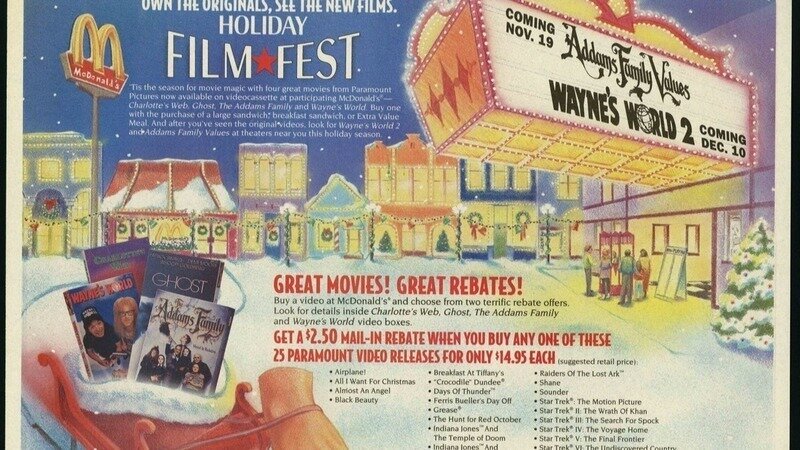 Back in the 1990s, McDonald's had a unique and memorable tradition known as the Holiday Film Festival. This annual event allowed families to collect beloved movies from Orion Home Video which included Kevin Costner's Oscar Winning hit Dances With Wolves, Paramount Home Entertainment, and Universal Pictures Home Entertainment with the purchase of any large sandwich or Extra Value Meal. These films brought joy and togetherness during the holiday season, offering a sense of nostalgia for everyone who participated. The VHS tapes collected at McDonald's really made great Christmas gifts to many. I have the McDonald's VHS of Charlotte's Web from the 1993 McDonald's Holiday Film Festival which that year also had Ghost, Wayne's World and The Addams Family to help promote Wayne's World 2 and Addams Family Values.