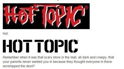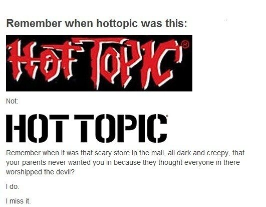 Back then Hot topic was a store people were afraid of, parents wouldn't dare follow you in, or sometimes even let you in, for fear of devil worshipers or other things. Hot Topic sold many many goth styles of clothing which, no longer do they sell.