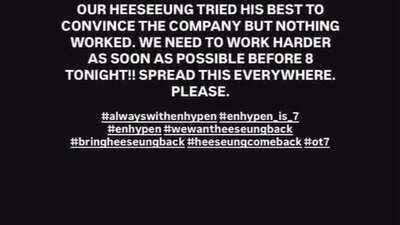 To the company, we implore you to recognize the widespread love and support for Heeseung. Fans across the globe are united in their demand—Heeseung must remain with ENHYPEN. Removing him disregards the dedication and passion he has poured into building this group's success. It also shows a lack of respect for the fans who have stood by ENHYPEN through thick and thin.