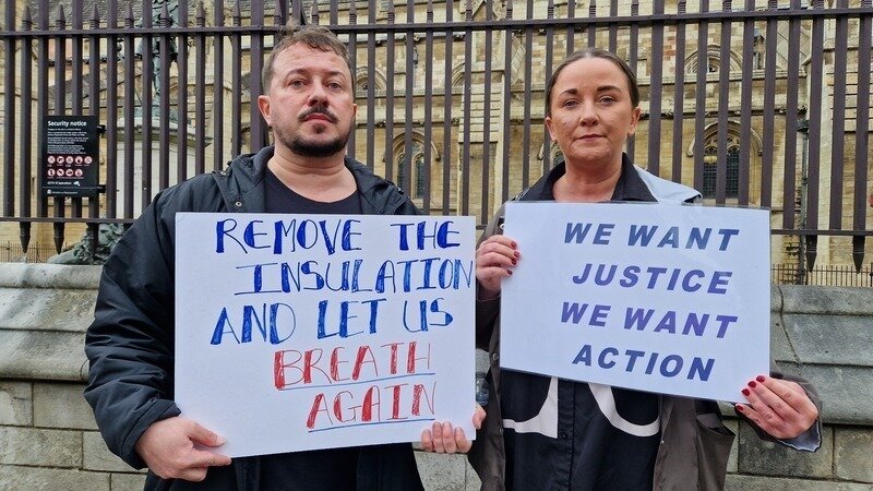 Following a protest, they joined MPs at a lobby exposing how some players in the cavity wall insulation industry and several "parasitic legal firms" have exploited homeowners and government green grants.