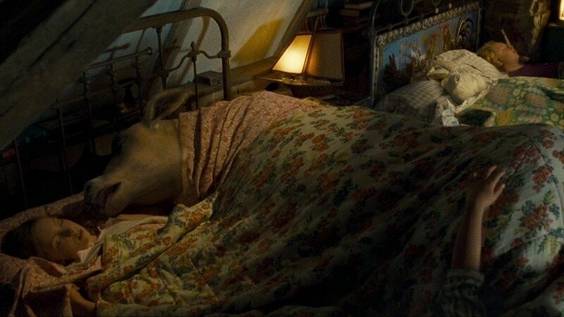 Bedroom in attic, delightful painted decorations out of place for poor family. Even if talented, mama would not have time. Her updo was for bath. Real goat walked up stairs. Real Jersey cow did not like to walk out of clean trailer in morning into "mud". Real elephant caught virus and died, CGI based on that footage. Seems normal for Nanny to pull fully lit lantern from under skirt. Animals in beds really "inflated balloon-like things".