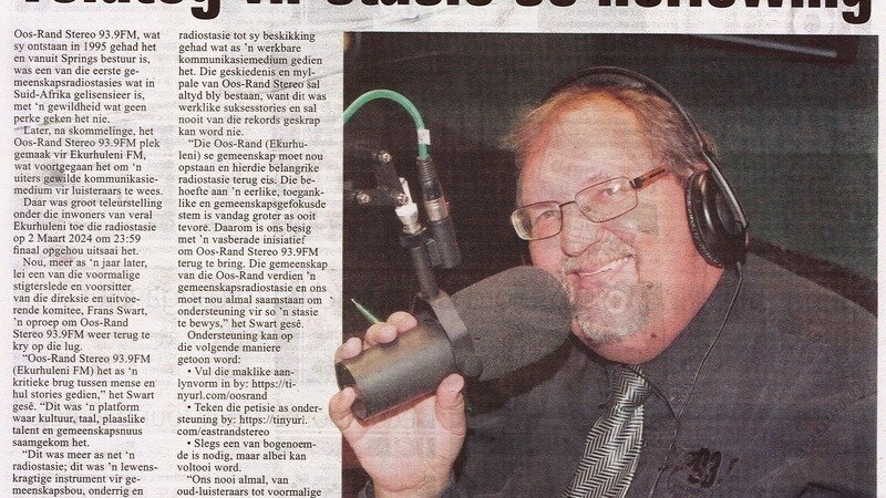 Ons ondersteuning om Oos-Rand Stereo terug te bring, vorder mooi. SIen ook die voorbladstorie in vandag se Springs Advertiser. Dit wys net hoe belangrik Oos-Rand Stereo vir die hele Oos-Rand (Ekuhuleni) was. Stuur asb die petisieskakel na al jou vriende en familie! Groot Waardering!